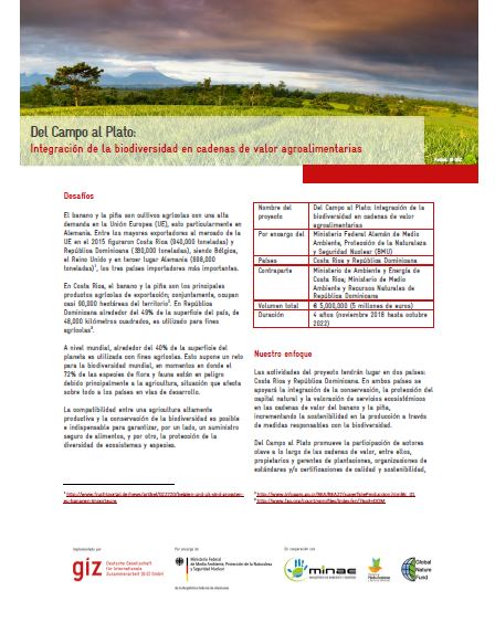 Las actividades del proyecto tienen lugar en dos países: Costa Rica y República Dominicana. En ambos países se apoya la integración de la conservación, la protección del capital natural y la valoración de servicios ecosistémicos en las cadenas de valor del banano y la piña, incrementando la sostenibilidad en la producción a través de medidas responsables con la biodiversidad.